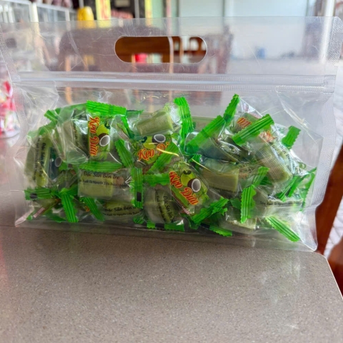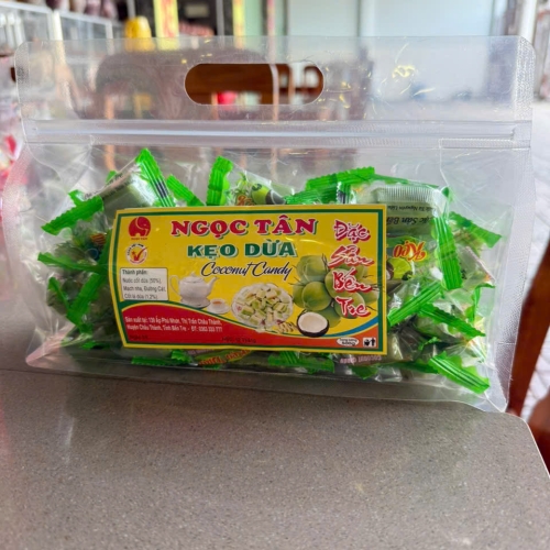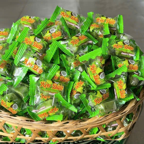Có màu xanh lá dứa đặc trưng, cùng với vị ngọt nhẹ và hương thơm tự nhiên từ dừa và lá dứa. Thành phần: Kẹo dừa lá dứa là loại kẹo mềm, dẻo được làm từ dừa nạo, nước cốt lá dứa và một số nguyên liệu khác như đường, sữa đặc... Quy cách đống gói: 500g/Gói